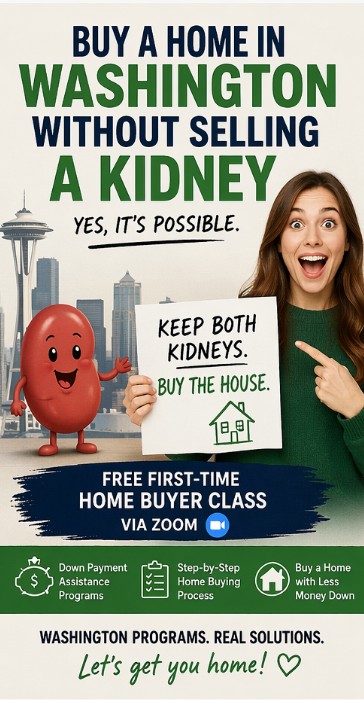 Join our FREE First-Time Home Buyer Class and learn how Washington State Down Payment Assistance can help you buy a home without draining your savings (or selling a kidney 😅).